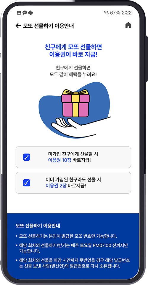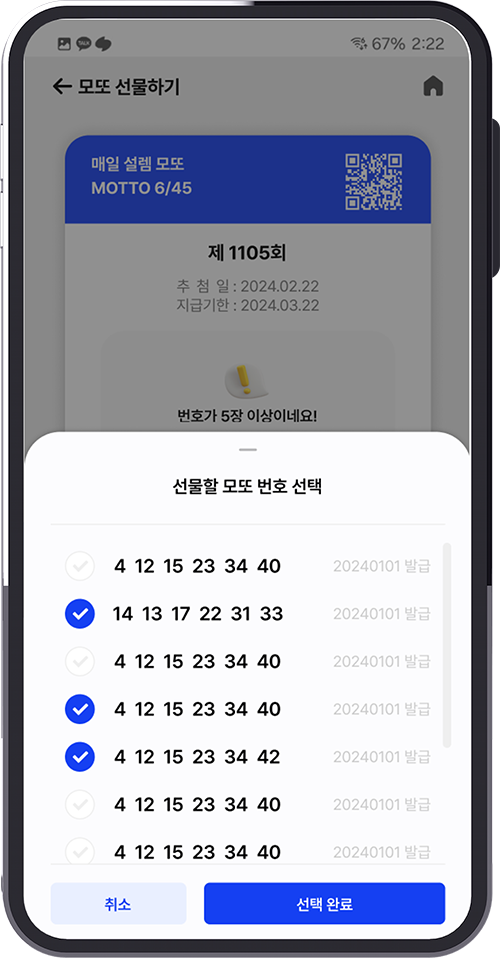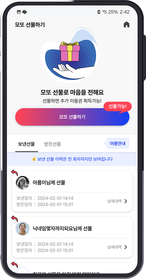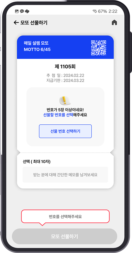 내가 발급한 모또번호를 친구에게 선물할 수 있어요.